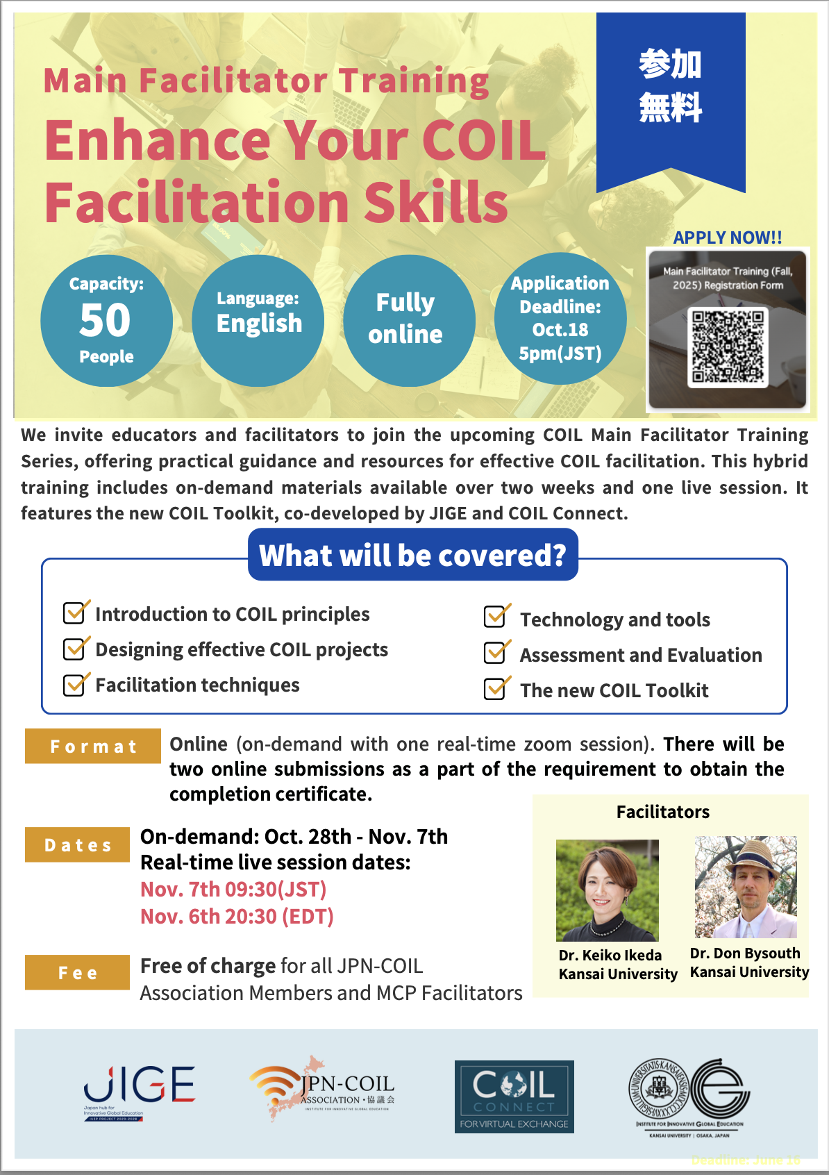 第2回 Main Facilitator Trainingの参加者募集を開始しました!締め切りは10/18(日)の午後5時(日本時間)となります。詳細は、下記のフライヤーをご覧ください。