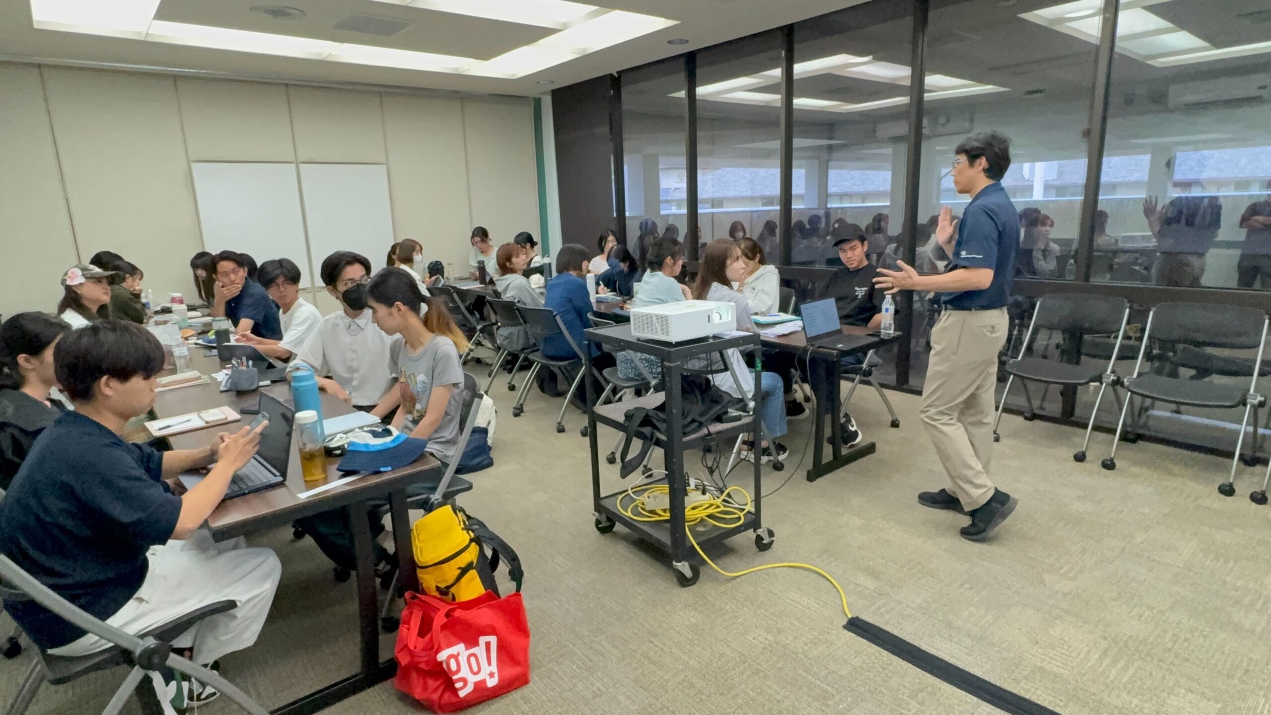 また、ハワイ電力のケン氏に、公平性、リーダーシップ、優れた組織であること、そして不幸なマウイ島火災のような災害予測の課題について語っていただきました。また学生を率いてワークショップを実施し、問題と解決策のブレインストーミングも実施されました。続いてウラ先生のクラスでは、学生がハワイ大学の学生と協力し、気候変動や廃棄物管理といった課題を分析し、日本、ハワイ、その他の太平洋諸国に適用する作業を行われ、ハワイ大学の学生と話し合い、共に作業し、国際的なチームワークを学ぶ良い機会となりました。ピザ休憩の後、学生たちはフィールドワークのインタビューのために外出し、プログラムの3つの柱(リーダーシップ、環境、歴史文化)のいずれかに関するデータを収集するため、現地の学生たちから聞き取りを行いました。