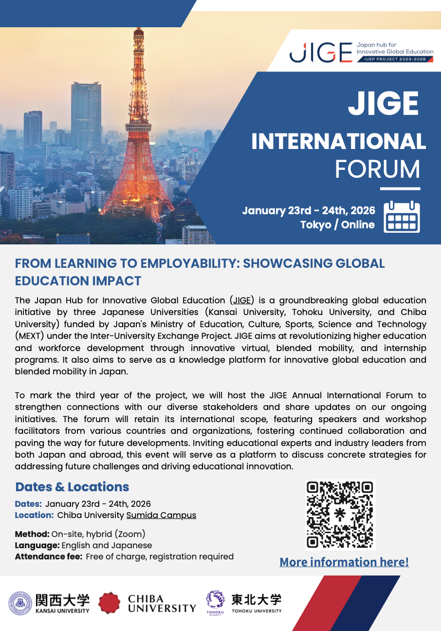 この度、2026年1123(金)・24(土)に、千葉大学 墨田墨田キャンパスにて、第3回JIGEフォーラムを開催いたします。詳細は以下のリンクまたはフライヤーよりご確認ください。https://linktr.ee/JIGEForum2026