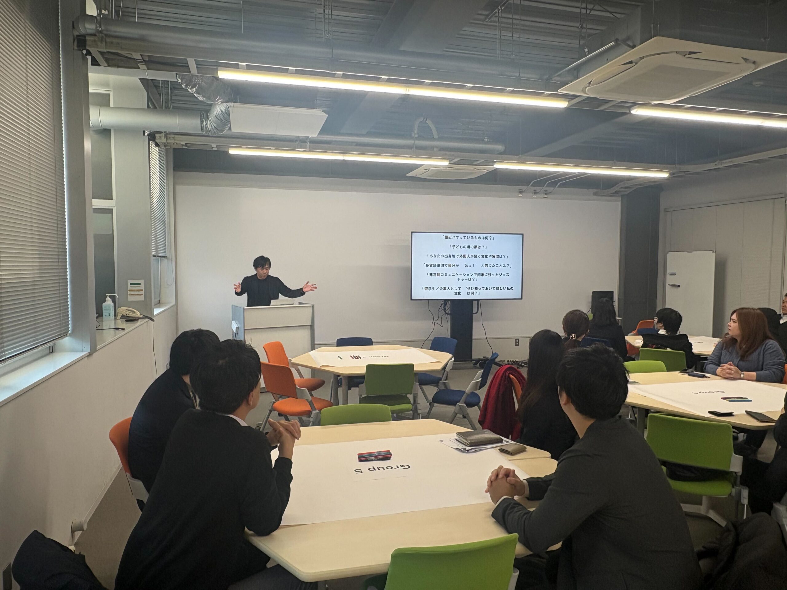 今回のワークショップでは、「外国人材との共創促進ファシリテーション」および「日本人企業人が言いにくいことを丁寧に伝える共感対話」という2つのテーマのもと、池田佳子教授(関西大学)および古川智樹教授(関西大学)によるレクチャーが行われました。共創促進パートでは、「異文化・異能レイヤー」および「異能を活かす組織文化をつくる」について学んだ後、企業人と留学生がグループに分かれ、自己発見ワークの一環として、自分たちのグループの「パワーハウス・ビルダー」に取り組みました。さらに、実際の企業事例を用いたグループ分析やクロスグループでの共有を通じて、相互理解を深めながら十分な意見交換が行われました。
