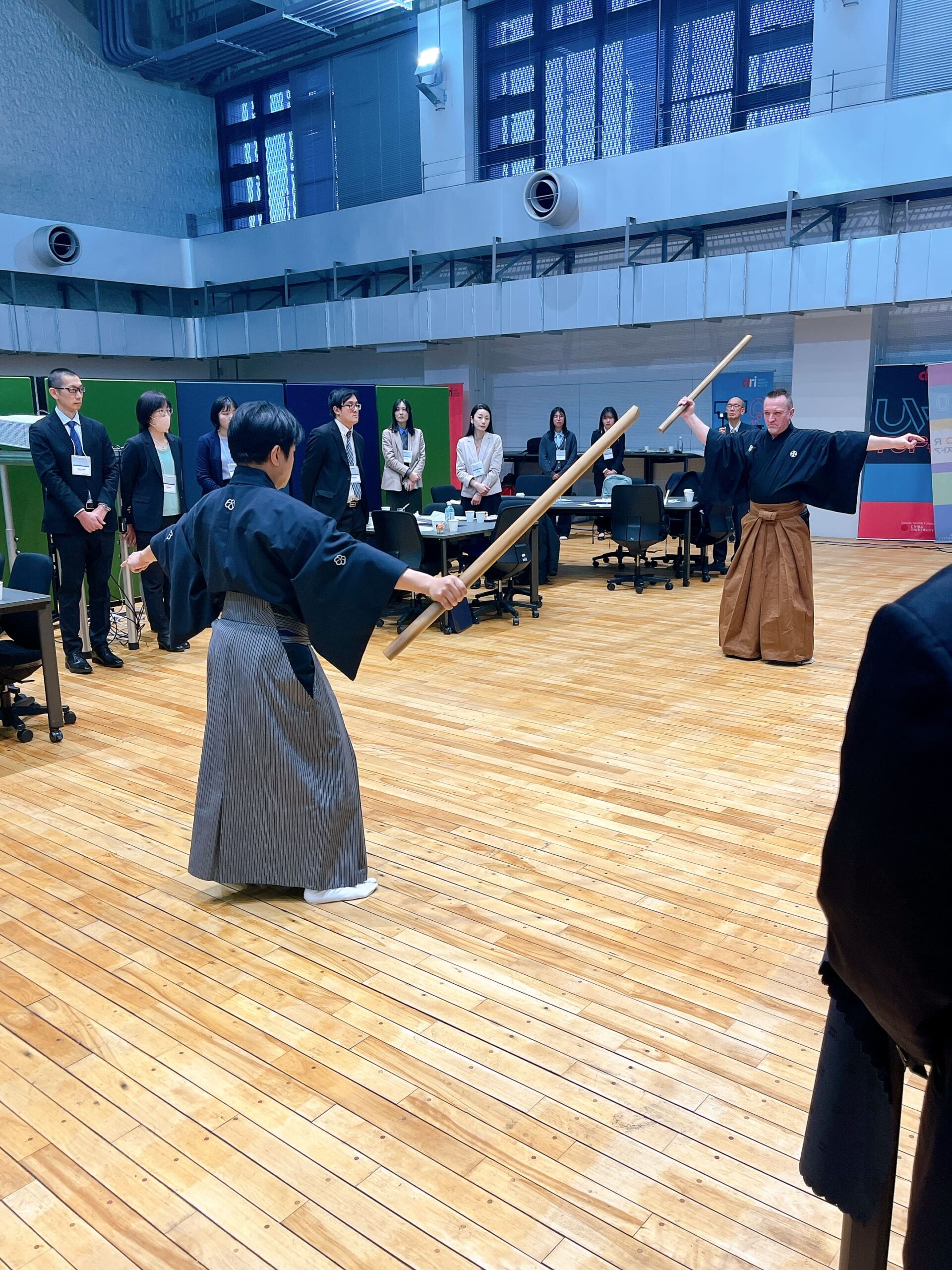 初日の締めのイベントとして、Alexander Bennett教授(関西大学)と大庭良介教授(筑波大学)による、武道のデモンストレーションがおこなわれ、参加者たちは初めて目にする本格的な"Budo"のパフォーマンスに大変盛り上がっていました。