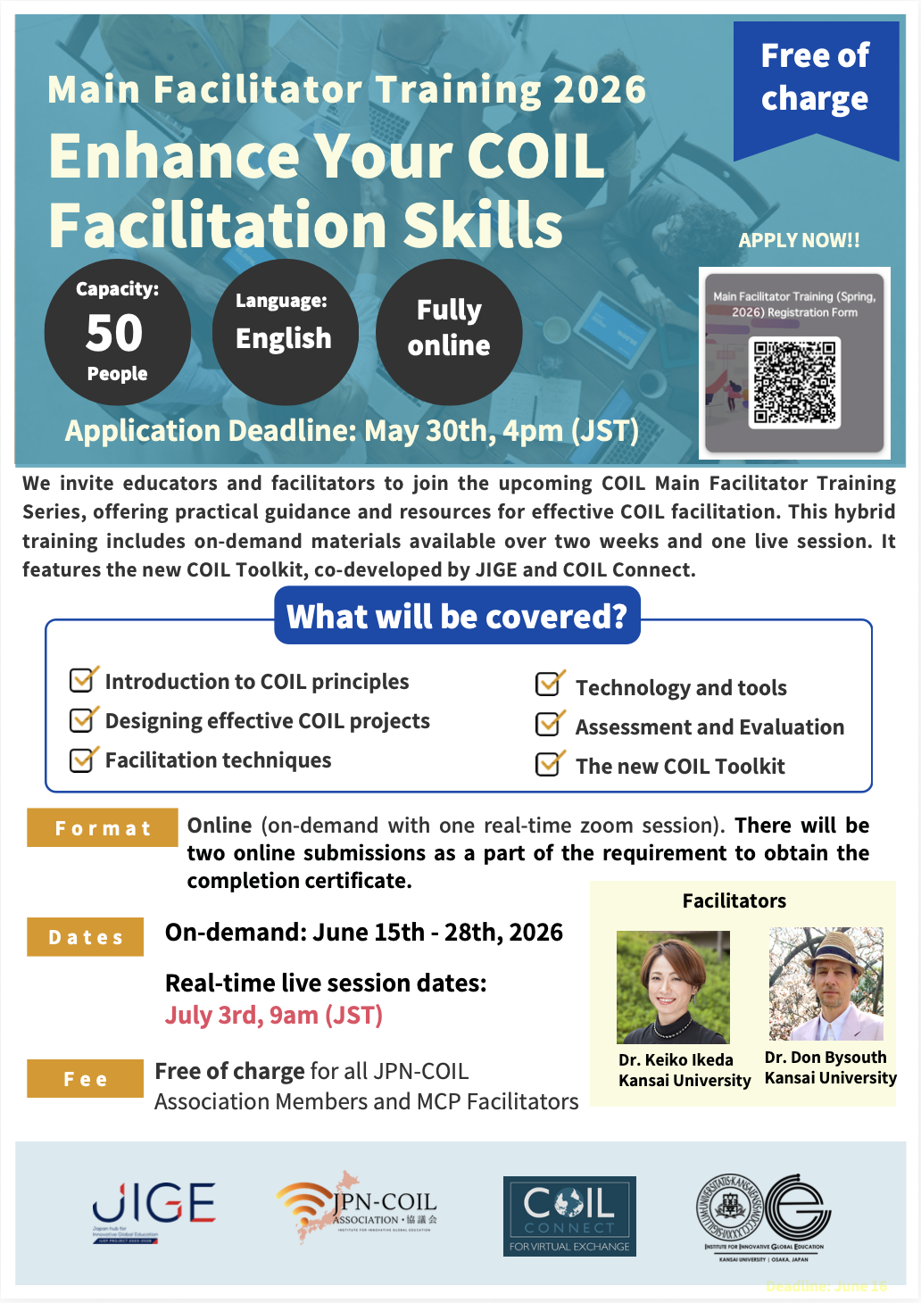 第3回 COIL Main Facilitator Trainingを、2026年6月から7月にかけて実施します。